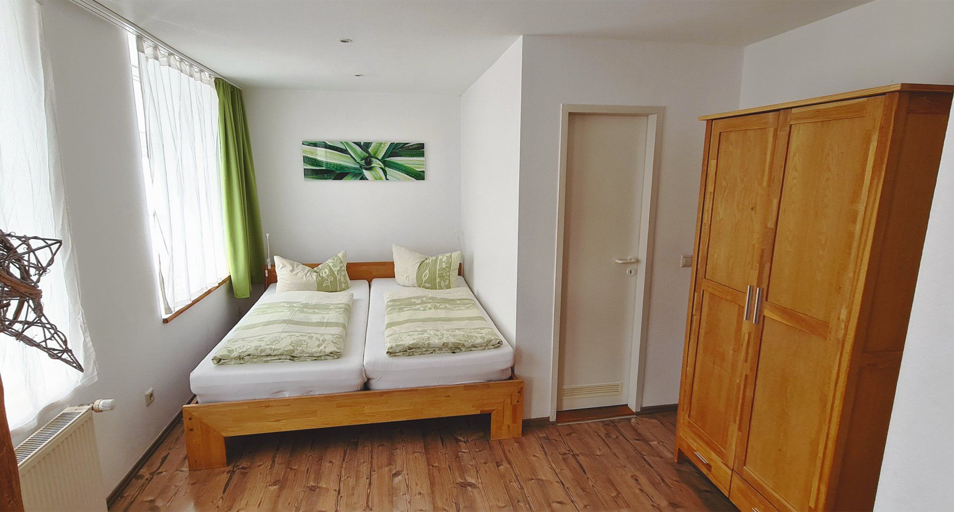 Das Appartement 2 umfasst 40m² und erstreckt sich auf 2 Etagen. Im Erdgeschoss befindet sich der Aufenthaltsraum sowie die Küche auf 25m². Auf der 1. Etage befindet sich das Schlafzimmer auf 15m². Die Wohnung ist für bis zu 6 Personen nutzbar.